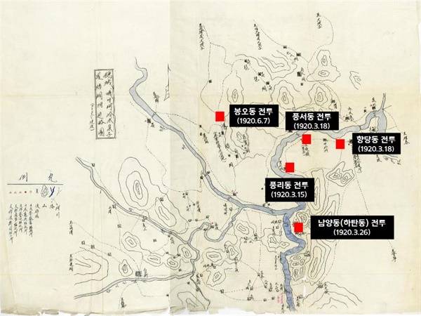 | ▲ 1920년 3~6월 두만강 국경 근처에서 전개된 최진동 부대의 전투도. 일제가 당시 보고서에 첨부한 지도 위에 해당 전투 지역 위치를 표시했다. |