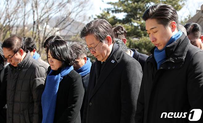 (서울=뉴스1) 이승배 기자 = 이재명 더불어민주당 대표가 3.1절인 1일 서울 용산구 효창공원 백범 김구 묘역을 찾아 참배하고 있다. 2024.3.1/뉴스1
