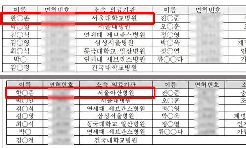앞서 복지부는 이날 오전 기존 공고문에 적힌 전공의 ‘한○존’의 소속 의료기관을 ‘서울대학교병원’에서 ‘서울아산병원’으로 수정했다. 소속 의료기관을 잘못 적어 바로잡았지만 면허번호도 여전히 틀린 상태였다. 전공의 ‘한○존’의 정보는 전부 잘못 기재됐던 셈이다.