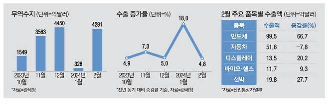 반도체 수출 증가로 대(對)중국 무역수지도 개선됐다. 중국은 한국산 반도체 36.6%를 수출하는 주력 국가다. 대중 반도체 수출은 1월 44% 늘어난 데 이어 지난달에도 26.7% 늘었다. 반도체 효과에 지난달 대중 무역수지는 2억4000만달러를 기록하며 17개월 만에 흑자로 돌아섰다.