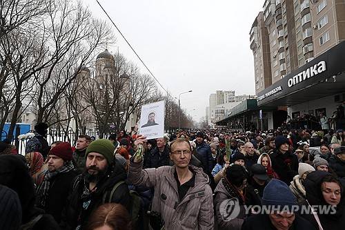 epa11190931 Russian people follow the hearse with the coffin of late Russian opposition leader Alexei Navalny outside the Church of the Icon of the Mother of God during his funeral in Moscow, Russia, 01 March 2024. Outspoken Kremlin critic Navalny died aged 47 in an arctic penal colony on 16 February 2024 after being transferred there in 2023. The colony is considered to be one of the world’s harshest prisons. The poster with the image of Alexei Navalny reads: ‘There is a Prophet in His Homeland’. EPA/MAXIM SHIPENKOV