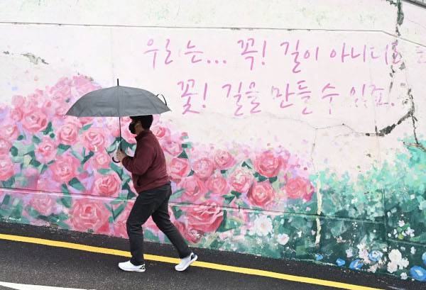 서울 서초구 동덕여자고등학교 앞에 아름다운 꽃 벽화 옆으로 마음을 울리는 글귀가 새겨져 있습니다. 지금 내리는 비가 귀찮은 존재로 여겨질 수도 있지만 아름다운 꽃망울을 터뜨리는 봄비가 될 수 있듯이 말이죠. 모든 일을 긍정적인 시각으로 세상을 바라보면 좋겠습니다.