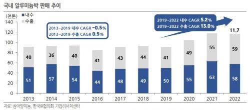 알루미늄박 시장은 그동안 활용처가 고정돼 있다 보니 시장이 정체돼 왔다. 국내 알루미늄박 수요는 2012년 이후 2019년까지 연간 9만 톤 수준을 유지했다. 그러나 최근 이차전지용 양극박 수요가 증가하면서 2020년 10만4000톤에서 2022년 11만7000톤으로 급성장했다.
