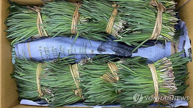 (김해=연합뉴스) 최병길 기자 = 봄철 보약으로 불리는 초벌부추가 경남 김해시 대동면 대동농협 부추산지경매장에서 경매를 기다리고 있다. 2024.3.2