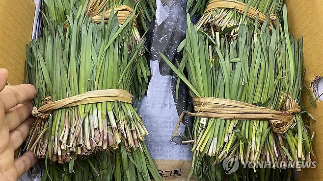 (김해=연합뉴스) 최병길 기자 = 봄철 보약으로 불리는 초벌부추가 경남 김해시 대동면 대동농협 부추산지경매장에서 경매를 기다리고 있다. 2024.3.2