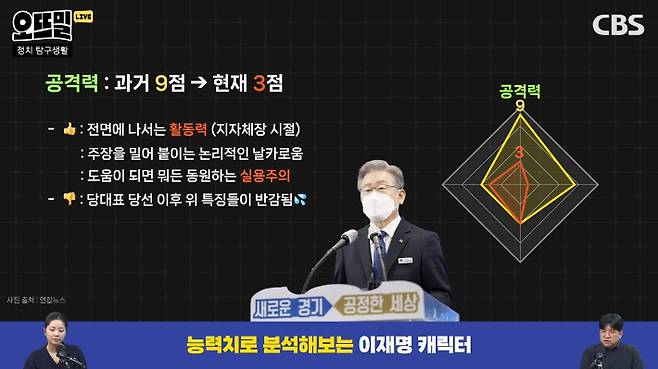 ◆ 김민하> 제가 볼 땐, 과거에 지자체장 할 때의 이재명, 민주당 대표로서의 이재명, 이 두 캐릭터는 좀 차이가 있어요. 예를 들어 공격력으로 치면, 과거 이재명 시장, 이재명 도지사 시절엔 거의 10점 만점에 9점이라고 할 수 있을 정도로 높습니다. 지자체장 시절의 이재명 대표는, 막 전면에 나서는 스타일이었어요. 계곡 노점 철거할 때 직접 나서서 설득하고, 코로나19 격리 시설도 직접 나서서 기숙사를 확보한다든지, 신천지를 찾아간다든지, 이렇게 해결하지 않았습니까? 그게 실질적 효력이 있든지 없든지 간에 그런 모습들을 보면 지지자들 입장에서는 대단하다는 느낌을 받게 되죠.