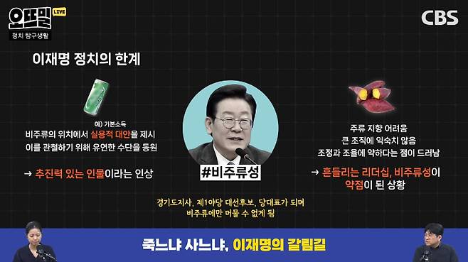 ◆ 김민하> 호불호가 굉장히 강하게 나뉘는 캐릭터입니다. 이거는 과거나 현재나 똑같은 것 같아요. 이재명 대표 좋아하시는 분들은 아직도 굉장히 좋아하고, 이재명 대표를 안 좋아하는 분들은 정말 혐오감이라고 부를 정도의 감정을 표현할 정도죠.