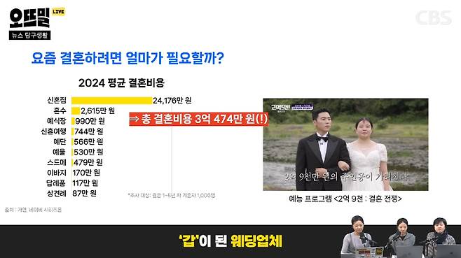 ◆ 임지윤> 얼마 전에 한 결혼정보회사에서 발표한 평균 결혼 비용이 3억 474만 원이었어요. 그중 주택 비용인 2억 4천만 원 정도를 빼도 드는 비용이 약 6천만 원 정도거든요.