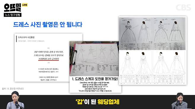◆ 임지윤> 최근 결혼한 친구들한테 물어봐서 황당한 사례들을 모아봤어요. 첫 번째 사례는 '드레스 투어'를 할 때 사진 촬영이 금지되는 경우가 있었다는 건데요. 피팅 비용만 10만 원 이상인 드레스 투어를 할 때 드레스 입은 사진을 못 찍게 하는 일부 업체들이 있었다고 합니다. 드레스 디자인의 저작권 보호를 위해서요. 반면 예비부부들은 어차피 SNS에 드레스 사진이 다 올라오는데 왜 못 찍게 하냐는 반응이고요.