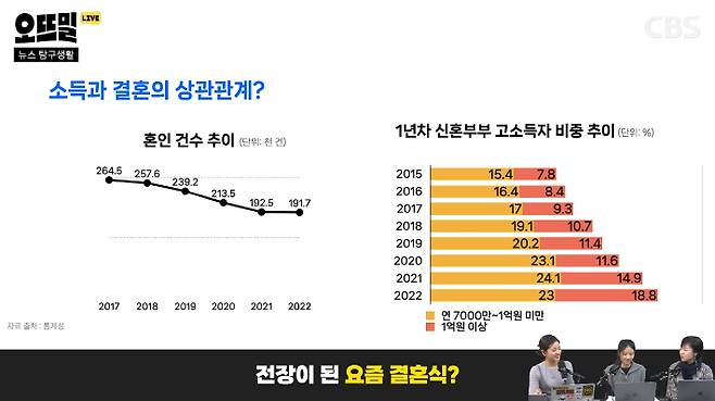 ◆ 임지윤> 실제로 혼인 건수는 감소하고 있는 반면에 결혼한 신혼부부의 평균 소득은 증가하고 있어요. 그만큼 소득이 있어야 결혼을 선택한다는 의미죠.
