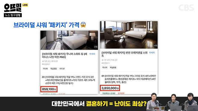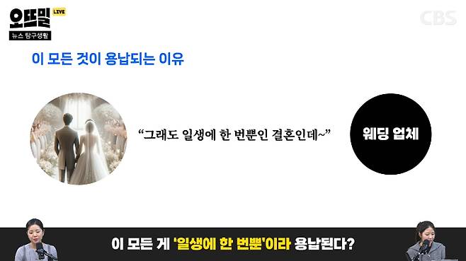 ◇ 채선아> 그들이 사용하는 마법의 용어가 있는데 그게 바로 '평생에 단 한 번'이라는 용어거든요. 이거면 모든 게 해결이 되는 거예요. 비싼 거와 조금 가성비 있는 것 중에 고민하더라도 평생에 단 한 번 있는 행사인데 신부님 더 좋은 거 하세요' 같은 말을 해버리면 선택하기가 쉽지 않거든요.