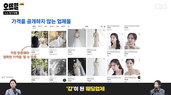 ◇ 채선아> '계약 먼저 걸어놓으세요. 나중에 어떻게 될지 몰라요 신부님' 하는 거죠. 그런데 요즘 이렇게 장사하는 곳이 없거든요. 미용실 같은 경우도 정찰제로 바뀌면서 금액이 나오잖아요. 어떻게 웨딩 업계에서는 부르는 게 값이 된 건지 그게 궁금해요.