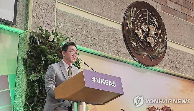 (서울=연합뉴스) 임상준 환경부 차관이 지난 29일 (현지시간) 케냐 나이로비 UNEP 본부에서 열린 제6차 유엔환경총회각료회의에 참석해 플라스틱 협약의 조속한 성안 등 환경위기 해결을 위한 국제사회의 노력을 촉구하기 위한 국가발언을 하고 있다. 2024.3.3 [환경부 제공. 재판매 및 DB 금지]