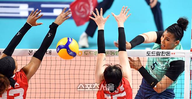 GS 실바가 3일 장충체육관에서 열린 2023-2024 V리그 여자부 GS칼텍스와 페퍼저축은행의 경기에서 페퍼 이중블로킹을 상대로 강타를 터트리고 있다. 2024.3.3. 장충 | 강영조 기자 kanjo@sportsseoul.com