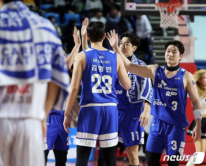 (서울=뉴스1) 김진환 기자 = 3일 오후 서울 송파구 잠실학생체육관에서 열린 2023-2024 정관장 프로농구 서울 SK와 부산 KCC의 경기, 90대69 대승을 거둔 서울 SK 선수들이 기쁨을 나누고 있다. 2024.3.3/뉴스1