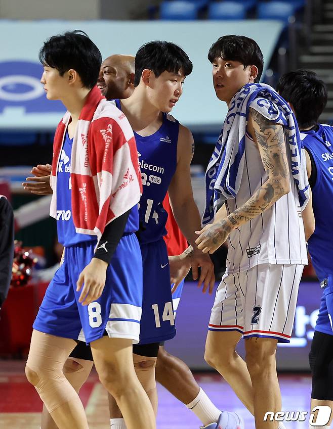 (서울=뉴스1) 김진환 기자 = 3일 오후 서울 송파구 잠실학생체육관에서 열린 2023-2024 정관장 프로농구 서울 SK와 부산 KCC의 경기, 90대69 대승을 거둔 서울 SK 선수들이 부산 KCC 최준용과 인사를 나누고 있다. 2024.3.3/뉴스1