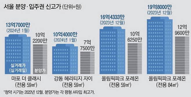 둔촌주공과 비슷한 시기에 분양한 서울 마포구 아현동 더클래시도 지난1월 전용면적 59㎡가 13억7000만원 신고가에 거래됐다. 분양 당시 당첨자 절반이 계약을 포기한 곳이다. 59㎡ 분양가는 10억원대였다.