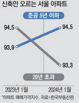 지난해 부동산 시장이 전체적으로 하락했음에도 불구하고 서울 신축 가격은 올랐다. 한국부동산원의 준공 시기별 아파트 매매가격 지수(2021년 6월 100 기준)를 살펴보면 서울의 준공 5년 이내 신축 아파트는 1년 전 93.9에서 현재 94.5로 올랐지만 20년 이상 구축은 94.5에서 93.3으로 하락했다. 전체 시장이 침체했어도 신축은 올랐다는 얘기다.