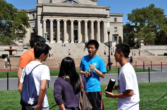 Orientation leader (in blue tee-shirt) briefs a group of new students from China about life on campus at Columbia University in New York, Sept. 2, 2009. [SHUTTERSTOCK]