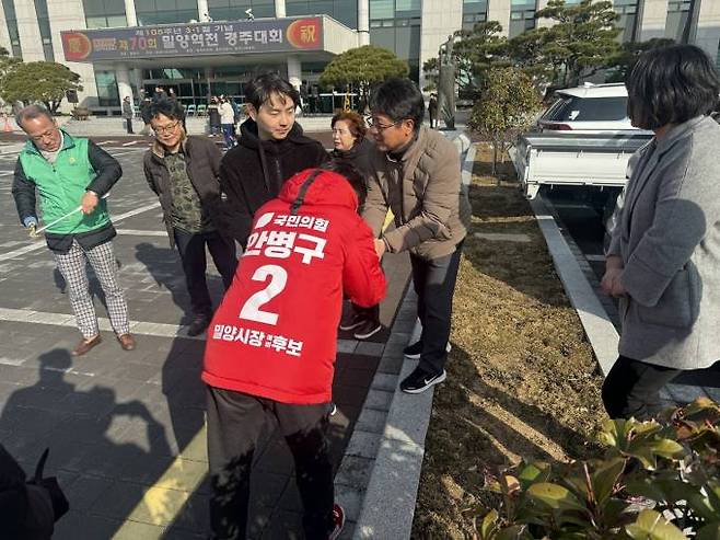 4·10 총선과 함께 치러지는 경남 밀양시장 보궐선거에 출마한 국민의힘 안병구 예비후보는 1일 밀양시청광장에서 열린 제105주년 삼일절 기념 제70회 밀양역전경주대회에 방문해 읍면동 참가 선수단을 격려하면서 지지를 호소했다