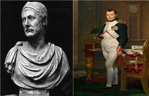 기원전 216년 8월, 알프스를 넘어 이탈리아로 침공한 한니발(왼쪽 사진)은 칸네에서 로마군 주력과 맞닥뜨렸다. 수적 열세에 처해 있던 그의 선택은 전면을 약화시켜 적을 유인하면서 양익에 강력한 군대를 배치해 로마군을 포위 섬멸하는 것이었다. 자칫 전면이 뚫려 로마군에게 각개격파당할 위험부담이 컸지만, 한니발은 가장 강하고 신뢰하는 병사들을 전면에 배치하고 이들을 직접 지휘함으로써 전면이 무너지지 않고 로마군을 원하는 위치까지 유인할 수 있을 것으로 계산했다. 로마군은 한니발의 의도대로 움직였고 그는 승리할 수 있었다.