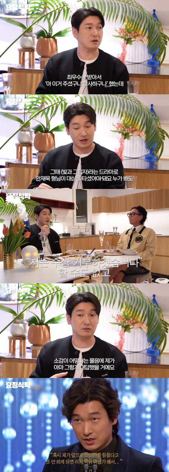 그는 "절반도 안 찍었을 때 남자 최우수 연기상을 받았다. 그런데 대상까지 받았다"면서 "최우수상 받아서 감사했지만, 최우수상 후보 중에서 대상이 결정되는 거였다. 그 때 누가 봐도 '빛과 그림자'라는 드라마로 안재욱 형님이 대상을 타셨어야 했다"고 털어놨다.