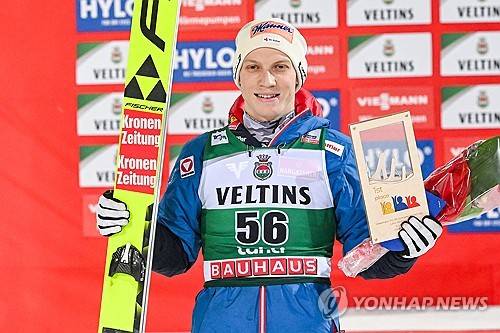 epa11197015 Winner Jan Hoerl of Austria celebrates on the podium after the Men's Individual HS130 competition at the FIS Ski Jumping World Cup event in Lahti, Finland, 03 March 2024. EPA/KIMMO BRANDT