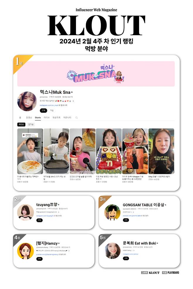 한편 2위는 930만 유튜버 '쯔양'(tzuyang), 3위 회사원에서 먹방 유튜버로 성공한 '이공삼'(GONGSAM TABLE), 4위 일반 가정집에서 먹방을 선보이는 콘텐츠로 유명한 '햄지'(Hamzy), 5위는 먹방 ASMR 유튜버 '문복희'(Eat with Boki)가 뒤를 이었다.