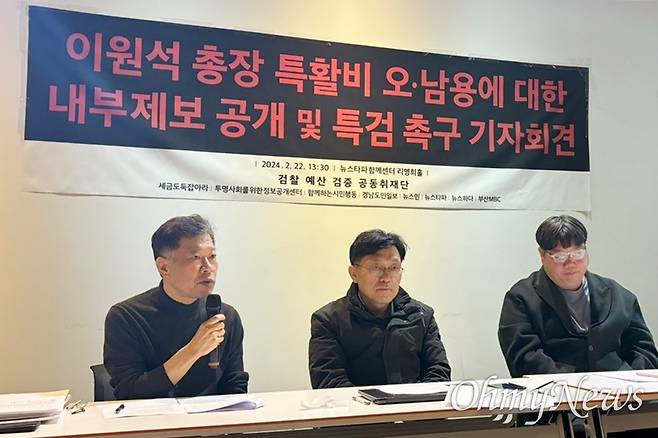 | ▲ 박중석 <뉴스타파> 기자가 22일 오후 1시 30분 서울 중구 뉴스타파함께센터 리영희홀에서 열린 '이원석 검찰총장 특수활동비 오·남용에 대한 내부제보 공개 및 특검 촉구 기자회견’에서 발언하고 있다. |