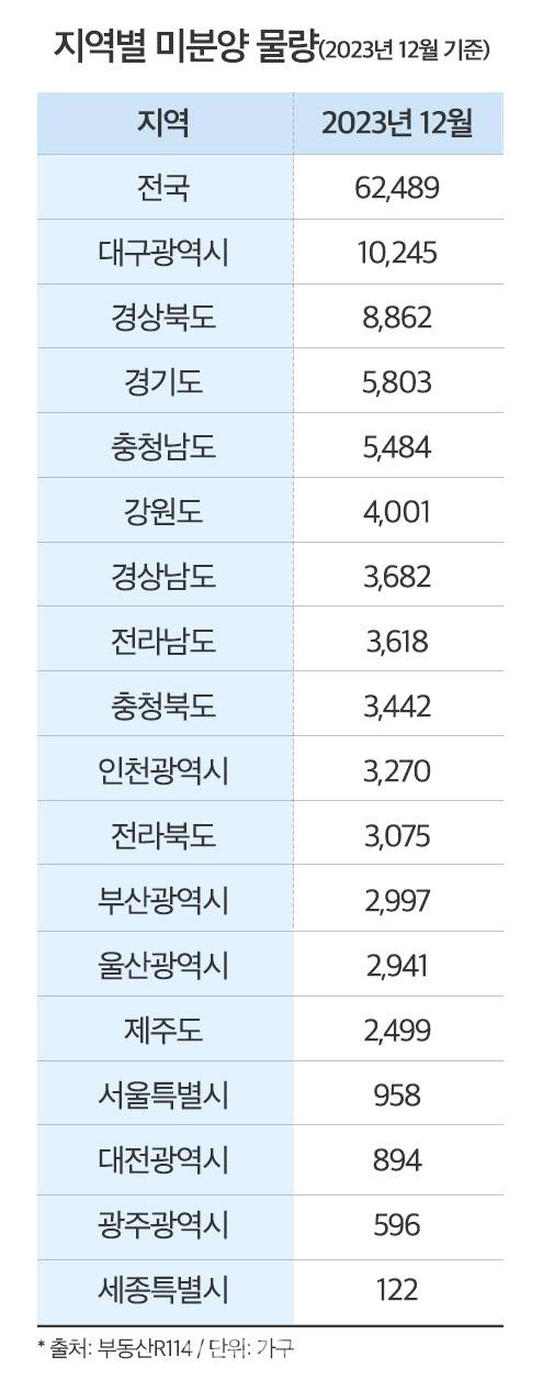 미분양이 가장 많은 곳은 1만245가구의 대구로 확인됐다. 대구는 전국에서 유일하게 지난 3월부터 12월까지 10개월 연속 미분양이 감소했지만 워낙 많은 물량이 쌓여있던 탓에 여전히 전국에서 가장 미분양이 많은 지역으로 남았다. 경북이 8862가구로 대구의 뒤를 이었고 경기(5803가구), 충남(5484가구) 등에도 많은 물량이 남은 것으로 확인됐다.