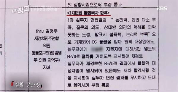 <시사직격>이 보도한 당시 검찰 공소장을 보면 2014년 상반기 신입은행 파일 비고란에 "thru 김영주 새정치민주연합 의원 영등포구의원(김영주 의원 지역구) 자녀"라는 내용이 기재되어 있습니다.