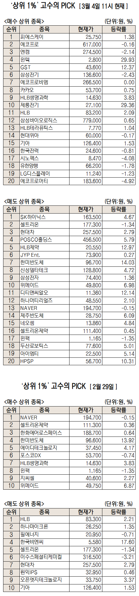 이날 미래에셋엠클럽에 따르면 미래에셋증권 주식 거래 고객 중 최근 1개월 간 투자수익률 상위 1%에 해당하는 ‘주식 초고수’들이 오전 11시까지 가장 많이 사들인 종목은 피에스케이로 집계됐다.