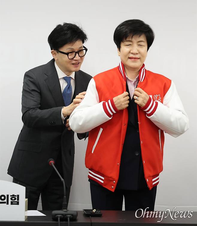 | ▲ 4일 오전 서울 여의도 국민의힘 중앙당사에서 열린 국민의힘 입당식에서 한동훈 국민의힘 비상대책위원장이 김영주 국회부의장에게 당 점퍼를 입혀주고 있다. |