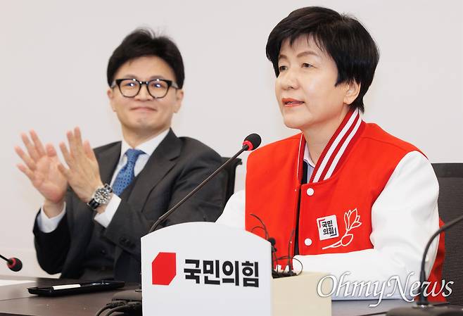 | ▲ 한동훈 국민의힘 비상대책위원장, 더불어민주당의 하위 평가 20% 통보에 반발해 민주당을 탈당한 김영주 국회 부의장이 4일 오전 서울 여의도 국민의힘 중앙당사에서 열린 국민의힘 입당식에 참석하고 있다. |