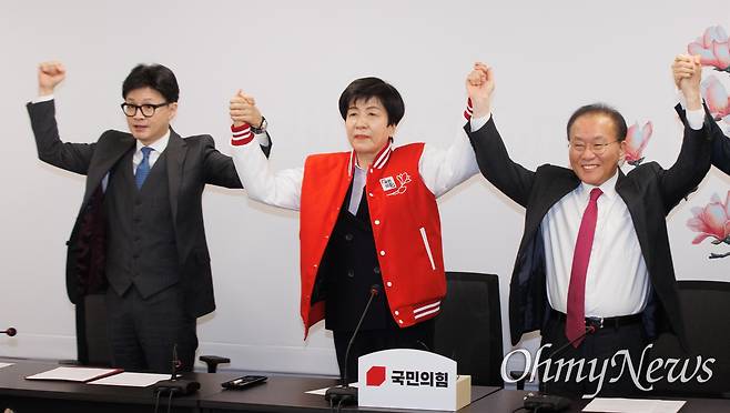 | ▲ 한동훈 국민의힘 비상대책위원장(왼쪽부터), 더불어민주당의 하위 평가 20% 통보에 반발해 민주당을 탈당한 김영주 국회 부의장, 윤재옥 원내대표가 4일 오전 서울 여의도 국민의힘 중앙당사에서 열린 국민의힘 입당식에서 기념촬영을 하고 있다. |