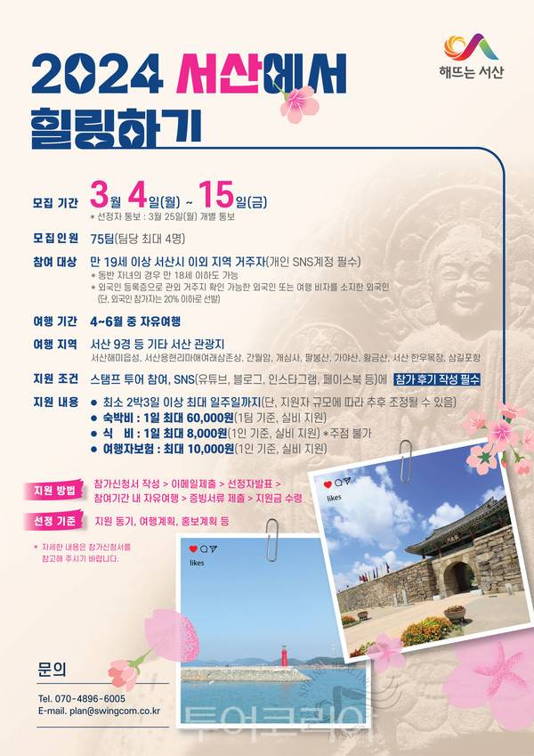 선정된 팀은 4월 1일부터 6월 30일까지 서산시 관내를 자유롭게 여행하며 서산관광 스탬프투어에 참여하고 후기 작성 기준에 따라 자신의 SNS에 여행 후기를 게시하면 지원금을 받을 수 있다.