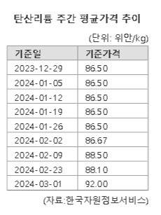 삼성선물 김광래 연구원은 "중국 리튬 광산 및 공장의 생산 중단 소식이 이어질 경우 탄산 리튬 가격은 미약하게나마 회복할 수 있을 것"이라면서도 "지나친 광산 개발과 전기차 성장 둔화로 인해 2025~2026년까지는 낮은 가격이 지속될 것으로 보인다"고 진단했다.