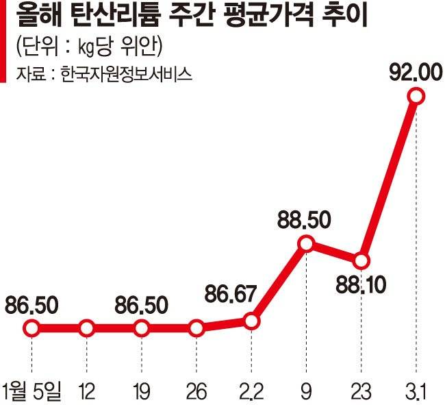 글로벌 리튬 가격의 키를 쥐고 있는 중국에서 공급 차질 우려가 커지고 있어서다.