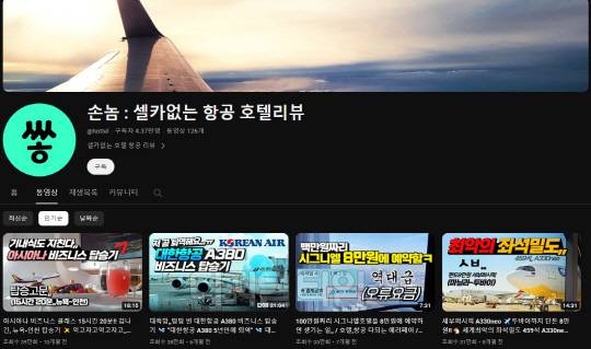 현재 손놈이 보유한 구독자 수는 4만 3000명, 125개 동영상의 누적 조회 수는 780만 회를 웃돈다. 최고 인기 영상인 '아시아나항공 비즈니스석 뉴욕-인천 탑승기'(39만 뷰), '대한항공 비즈니스석 타이페이-인천 탑승기'(37만 뷰) 등은 구독자 수의 10배에 달하는 높은 조회 수를 올리고 있다. 채널 내 조회 수 10만 회를 넘긴 화제의 영상만 25개에 이른다. 그 인기 비결은 무엇일까.