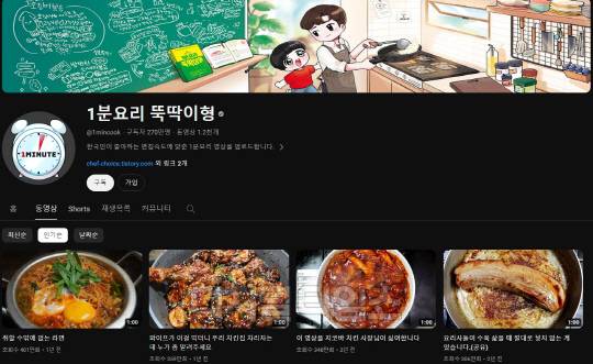 유튜브·인스타그램 빅데이터 분석사이트 IMR(Influencer Multi-Platform Ranking)의 2월 다섯째 주 유튜브 순위에 따르면, 가장 인기 있는 채널 1위는 '1분요리 뚝딱이형', 2위는 '요리용디', 3위는 '레시피 읽어주는 여자'다.