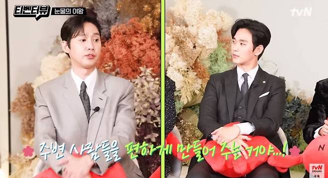 그렇다면 김수현이 겪은 ‘눈물의 여왕’ 출연자들은 어떨까. 이날 김수현은 박성훈에 대해 “처음 본 게 ‘더 글로리’라 첫 인상도 전재준이었다. 그런데 만나니까 너무 반갑더라. 처음 볼 때 손을 잡고 안 놔줬다. 되게 귀여운 형”이라며 애정을 전했다.