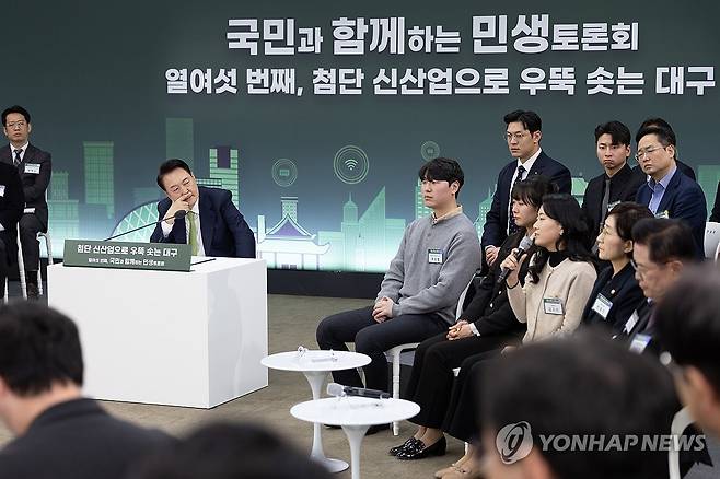 (대구=연합뉴스) 홍해인 기자 = 윤석열 대통령이 4일 대구 북구 경북대학교에서 '첨단 신산업으로 우뚝 솟는 대구'를 주제로 열린 열여섯 번째 국민과 함께하는 민생토론회에서 참석자의 발언을 듣고 있다. 2024.3.4 [대통령실 제공. 재판매 및 DB 금지]