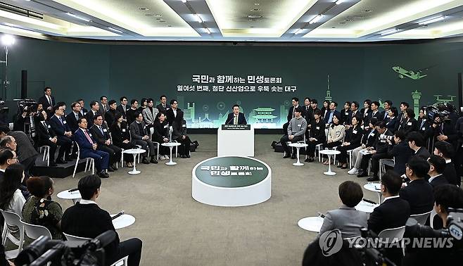 (대구=연합뉴스) 홍해인 기자 = 윤석열 대통령이 4일 대구 북구 경북대학교에서 '첨단 신산업으로 우뚝 솟는 대구'를 주제로 열린 열여섯 번째 국민과 함께하는 민생토론회에서 발언하고 있다. 2024.3.4 [대통령실 제공. 재판매 및 DB 금지]