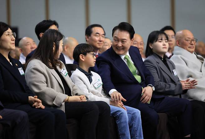 [대구=뉴시스] 윤석열 대통령이 4일 대구 북구 엑스코에서 열린 제4회 국립공원의 날 및 팔공산 국립공원 승격 기념식에서 참석자들과 대화하고 있다. (사진=대통령실 제공) 2024.03.04. photo@newsis.com *재판매 및 DB 금지