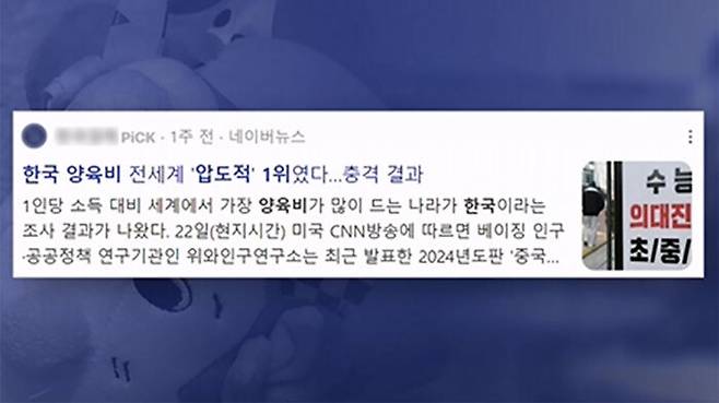 우리나라의 양육비 부담이 전 세계 1위라는 내용의 기사가 최근에 많이 나왔습니다. 중국의 한 연구소에서 만든 보고서 자료를 인용한 건데, 저희가 그 보고서를 꼼꼼히 살펴본 결과, 잘못된 부분이 있었습니다.