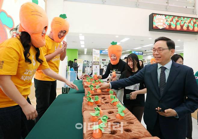 [이데일리 김태형 기자] 조성명(오른쪽) 강남구청장이 4일 강남구청 로비에서 열린 당근마켓 강남구청 단골맺기 첫 이벤트에 참가하고 있다.