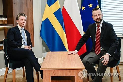epa11198568 Polish Minister of National Defense Wladyslaw Kosiniak-Kamysz (R) and Swedish Defense Minister Pal Jonson (L) during their meeting in Gdynia, Poland, 04 March 2024. The ministers will discuss, among other issues, Polish-Swedish cooperation in the fields of security and defense, implementation of contracts, assistance to Ukraine and welcoming Sweden as a member state of NATO. EPA/MARCIN GADOMSKI POLAND OUT