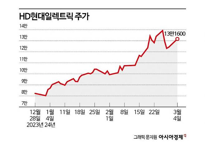 5일 금융투자업계에 따르면 HD현대일렉트릭 주가는 올해 들어 60% 상승했다. HD현대일렉트릭은 지난해 4분기 시장 기대치를 웃도는 실적을 달성했다. 4분기에 매출액 7973억원, 영업이익 1247억원을 기록했다. 전년 동기 대비 각각 18%, 144% 늘어난 규모다. 영업이익 시장 기대치는 982억원이었다.