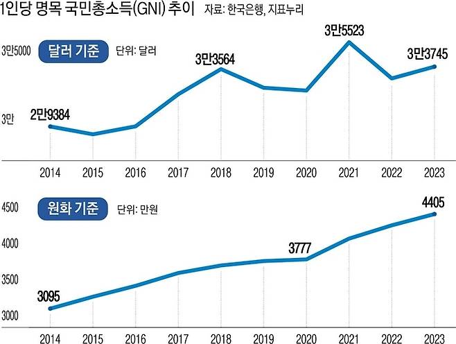 한국의 1인당 GNI는 2017년(3만1734달러) 처음 3만달러대에 들어선 뒤 2021년(3만5523달러)까지 늘었지만 코로나와 원·달러 환율 상승 등으로 2022년에는 3만2886달러까지 떨어졌다가 지난해엔 상승했다.