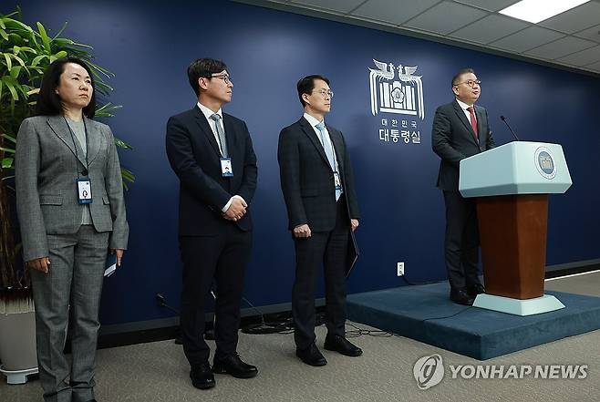 왼쪽부터 최선 첨단바이오비서관, 이경우 AI·디지털비서관, 최원호 연구개발(R&D) 혁신비서관, 박 수석. 2024.3.5